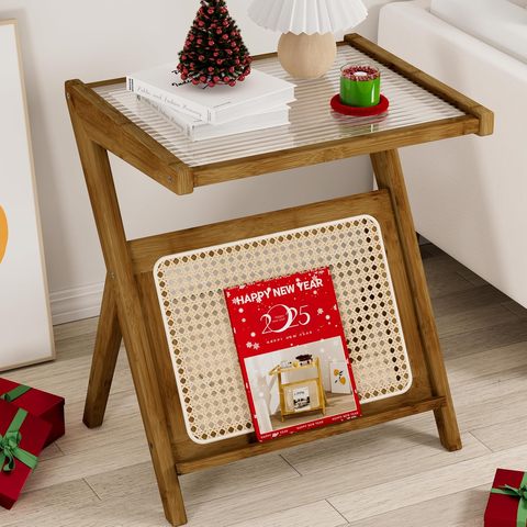 Mesa de centro pequeña de bambú Bohemia moderna con tapa de cristal para uso en hoteles, mesa auxiliar para dormitorio y sala de estar, mesa auxiliar con almacenamiento